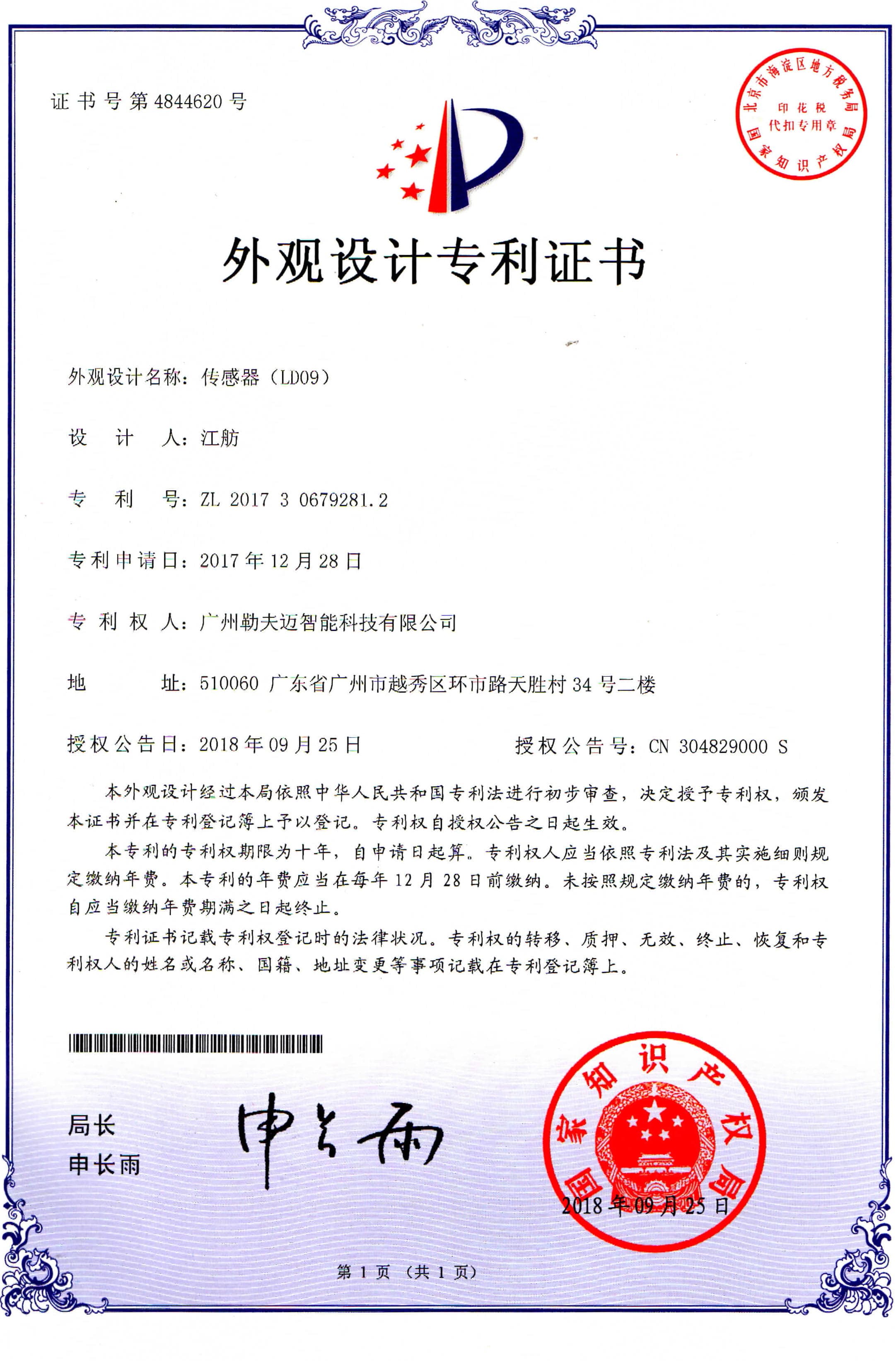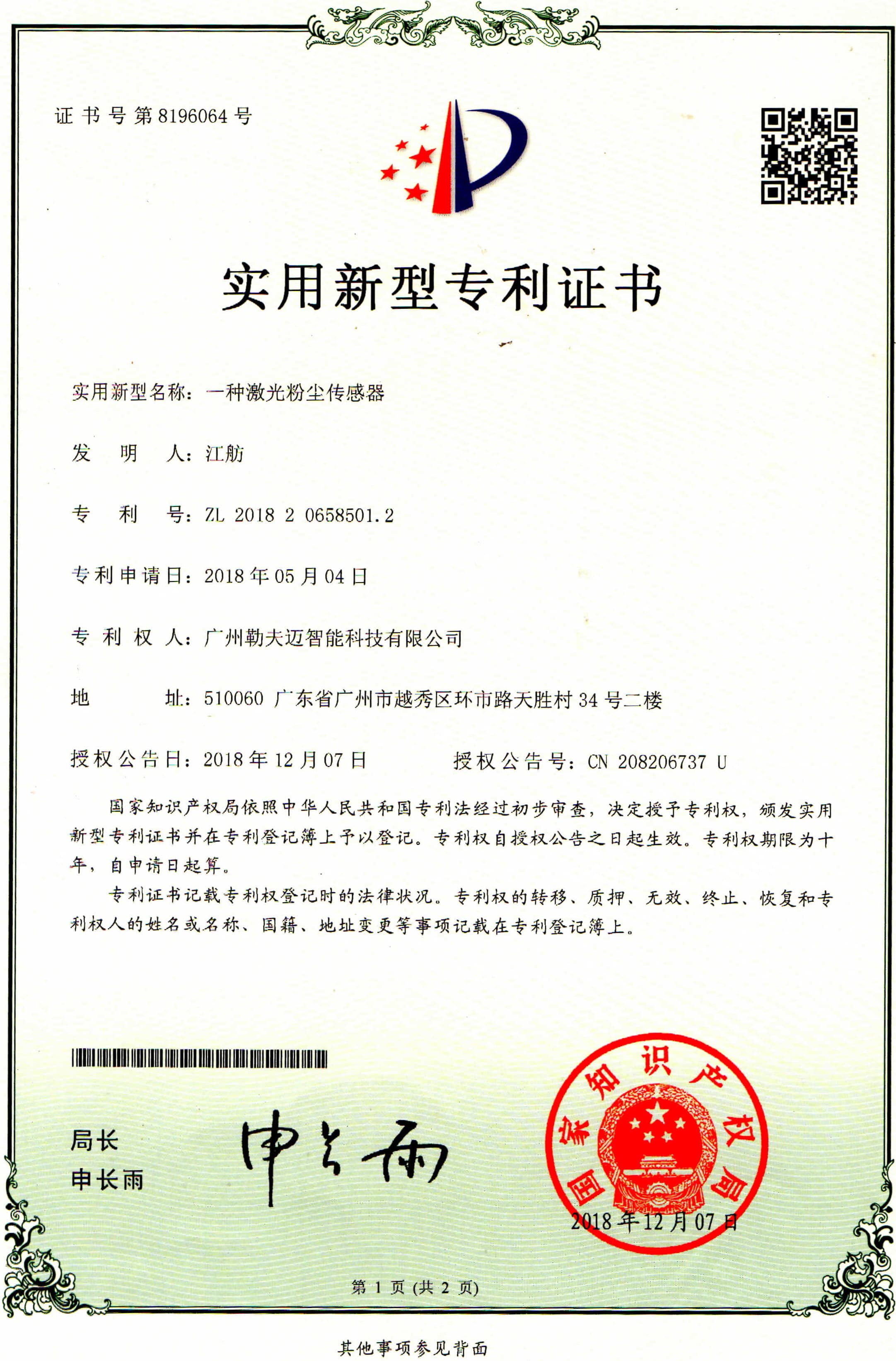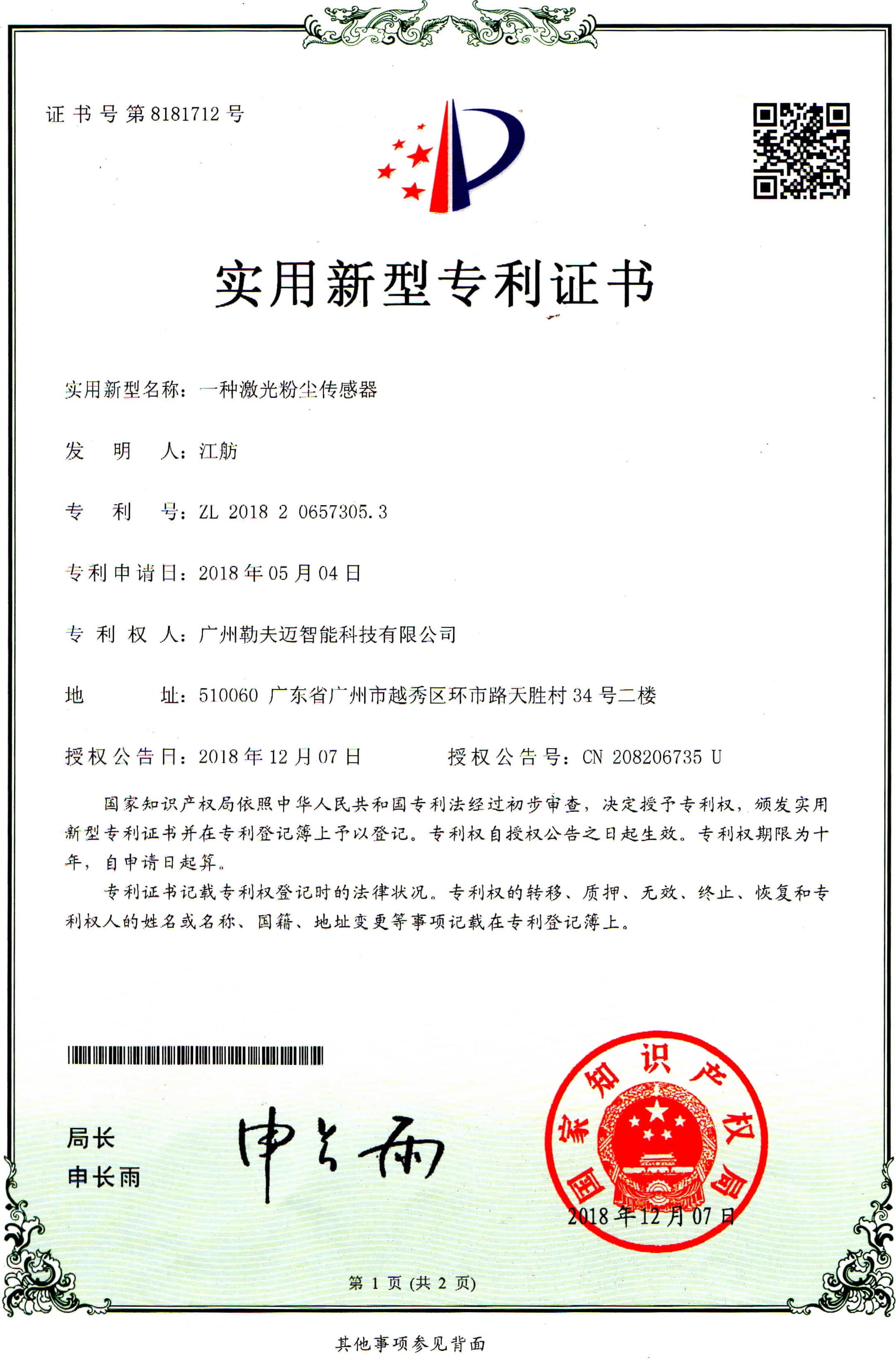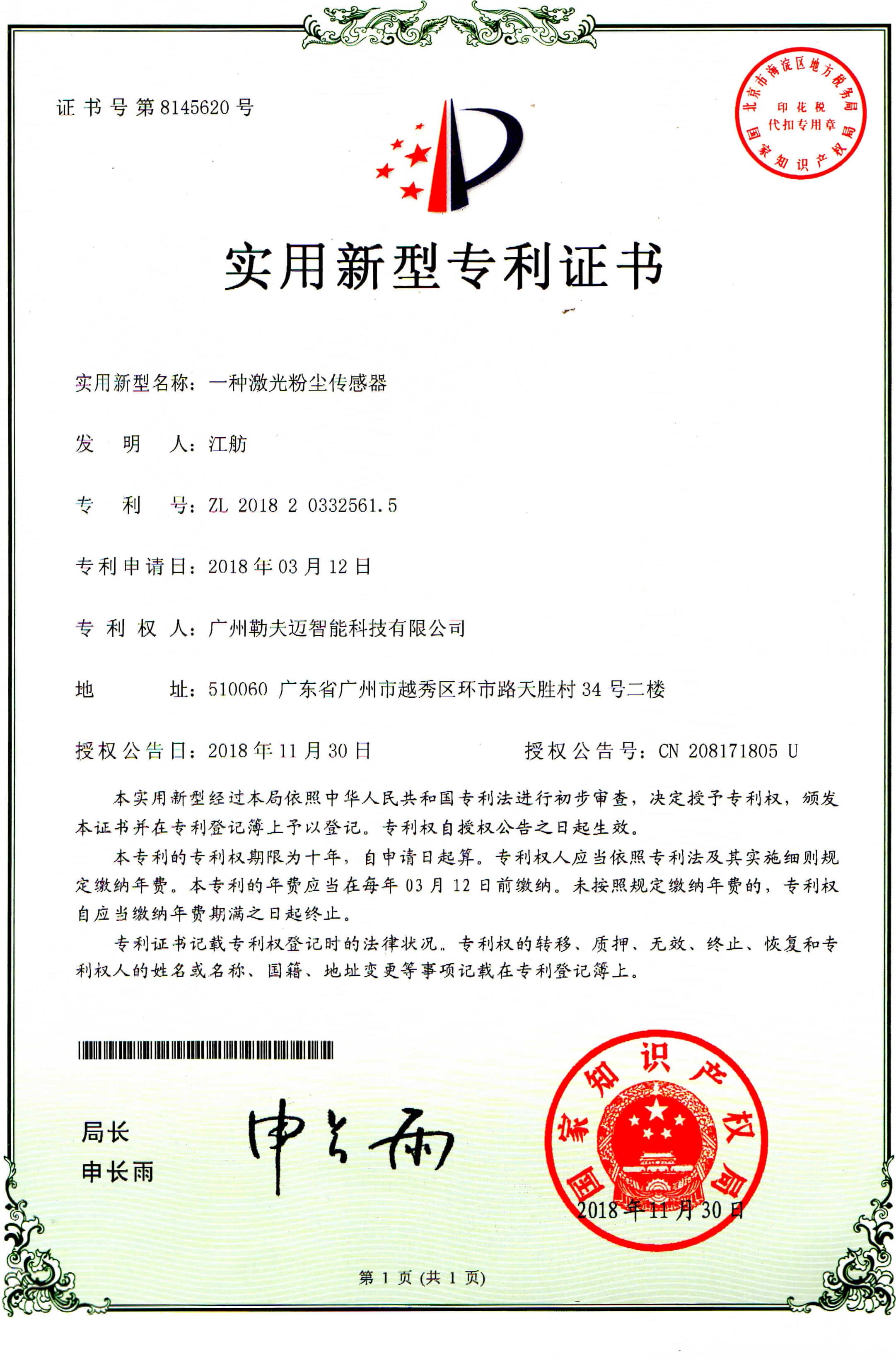 激光粉尘传感器专利证书